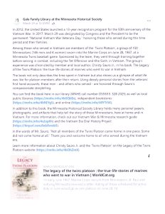 The Gale Family Library at the Minnesota Historical Society Facebook Post about Vietnam Veterans Day brings honor to our Vietnam Veterans. To further recognizance the importance of Vietnam Veterans Day, reference is made to the book “The Legacy of the Twins Platoon”, which tells the true-life stories of those who fought in Vietnam, and the impact it had on their families.